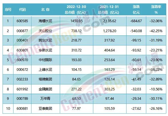 水泥行業(yè)最賺錢的海螺水泥,市值蒸發(fā)高達(dá)757.27億,股價跌幅32.06%。位居行業(yè)市值蒸發(fā)第一位。第二位至第十位分別是天山股份、冀東水泥、華新水泥、中材國際、上峰水泥、塔牌集團(tuán)、金隅集團(tuán)、萬年青、亞泰集團(tuán)。