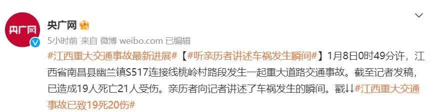 1月8日凌晨,江西南昌縣發(fā)生一起重大交通事故,截止1月9日16時,已造成19人死亡21人受傷。當(dāng)?shù)鼐用裢嘎?,因逝者家屬需早?點前到殯儀館排隊拿號,故村民于凌晨出殯,后被貨車撞上送行隊伍造成死傷。