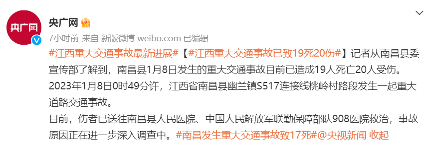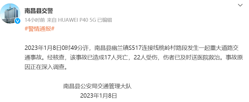 當(dāng)?shù)鼐用裉峁┑墓俜酵▓蠓Q,2023年1月8日0時50分,在南昌縣幽蘭鎮(zhèn)桃?guī)X村紅溪章家自然村發(fā)生一起重大交通事故,一輛重型半掛牽引車(屬于樂平某物流公司),撞上出殯隊伍,初步掌握,事故已造成17人死亡、22人受傷,傷者已送往醫(yī)院搶救,車輛核載質(zhì)量32700KG,車輛裝載砂石。