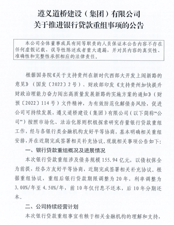 近日,貴州遵義最大城投——遵義道橋建設(shè)(集團(tuán))有限公司(下稱“遵義道橋”)披露的銀行貸款重組方案引起廣泛關(guān)注。根據(jù)重組協(xié)議,155.94億元銀行貸款重組后期限調(diào)整為20年,利率調(diào)整為3%/年~4.5%/年,前10年僅付息不還本,后10年分期還本。近156億元銀行債務(wù)展期至20年實(shí)屬罕見。