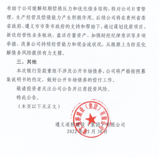 消息一出,震驚了金融圈,“它明明可以不還錢,卻選擇拖20年,可謂是優(yōu)雅的做老賴了”。盡管此次遵義道橋成功對(duì)約156億元銀行債務(wù)進(jìn)行了重組,但截至2022年6月末,遵義道橋的有息負(fù)債余額為457.54億元,除去此次重組的155.94億元銀行貸款外,遵義道橋還存在大量信托等非標(biāo)債務(wù),這部分非標(biāo)債務(wù)如何化解也備受關(guān)注。