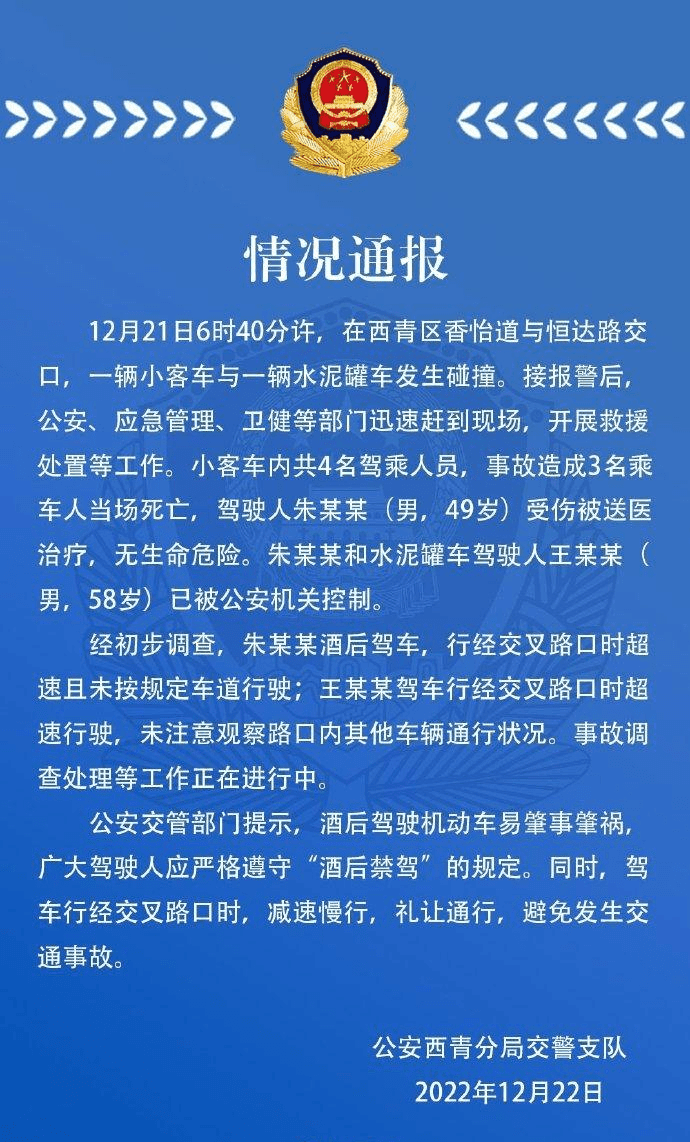 2022年12月21日,天津發(fā)生了一起水泥罐車與小客車碰撞的嚴(yán)重交通事故,造成了3人當(dāng)場死亡。當(dāng)?shù)鼐皆谕▓笾刑岬搅藘蓚€致命的細(xì)節(jié):第一,小客車的駕駛?cè)酥炷衬尘坪篑{車,行駛至交叉路口時超速且不按規(guī)定車道行駛;第二,水泥罐車駕駛?cè)送跄衬承薪?jīng)交叉路口時超速行駛,未注意觀察路口內(nèi)其他車輛通行狀況。