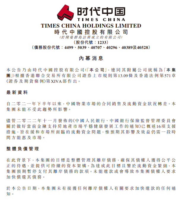 時代中國表示“深受2021年下半年以來,房地產(chǎn)銷售轉(zhuǎn)差的嚴重影響。公司的整體資金緊張,無法公平支付整體的離岸債,所以公司將整體暫停所有離岸債的支付”。這是時代中國第一次以官方公告的方式,承認自己無力支付債務,也就是公開債務爆雷了。