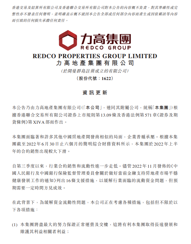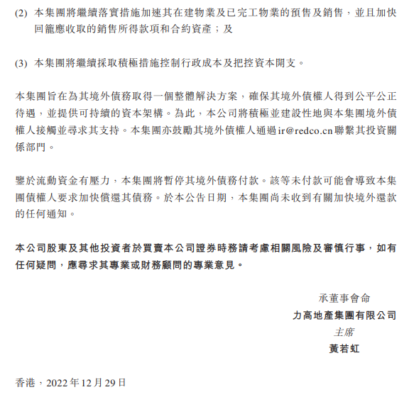 另一家,多年位列中國地產(chǎn)TOP100的力高集團,也在2022年的最后一個工作日發(fā)布公告,鑒于流動資金有壓力,將暫停境外債務付款。公司將盡最大的努力保證正常運營及交樓。