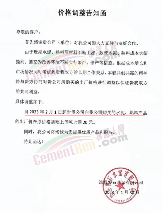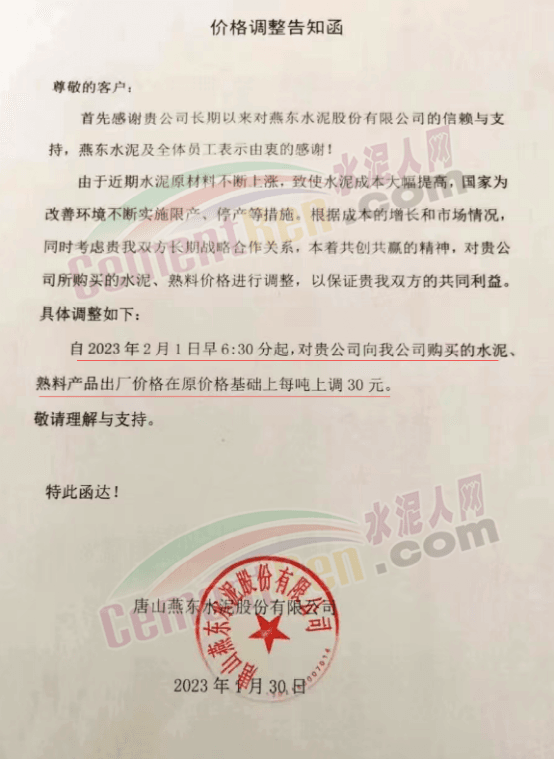 日前,唐山圣龍水泥有限公司、唐山燕東水泥股份有限公司、灤縣磐石水泥有限公司等水泥企業(yè)發(fā)布價格調(diào)整告知函稱,由于近期水泥、熟料原材料不斷上漲,致使水泥、熟料成本大幅提高;國家為改善環(huán)境不斷實行限產(chǎn)、停產(chǎn)等措施。根據(jù)成本增長和市場情況自2023年2月1日起對水泥、熟料產(chǎn)品的出廠價格上調(diào)20元/噸。