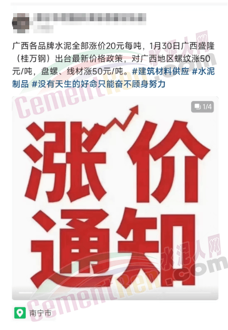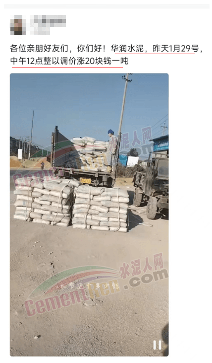 另一華潤水泥經(jīng)銷商發(fā)消息確認:“華潤水泥1月29日中午12點整已調(diào)價20元/噸。”