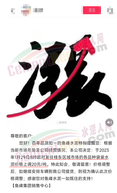 魚峰集團經(jīng)銷商轉發(fā)企業(yè)銷售中心對發(fā)往桂東區(qū)域市場的各品種袋裝水泥價格上調(diào)20元/噸的通知。