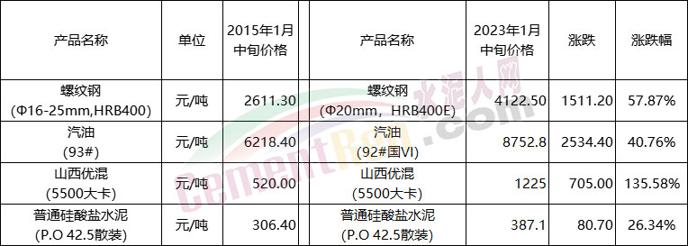 價格方面,國家統(tǒng)計局1月24日公布了2023年1月中旬流通領域重要生產(chǎn)資料市場價格變動情況。對比2015年相關數(shù)據(jù)可見,煤炭價格上漲了135.58%,螺紋鋼及汽油分別上漲了57.87%和40.76%,而P.O42.5散裝水泥價格僅上漲了26.34%。