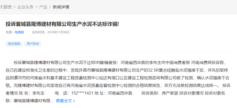 新聞?shì)浨轱@示,企業(yè)在2018年曾因生產(chǎn)水泥不達(dá)標(biāo)被投訴。