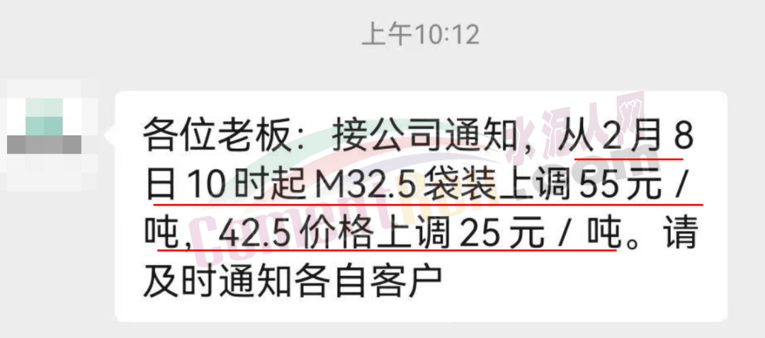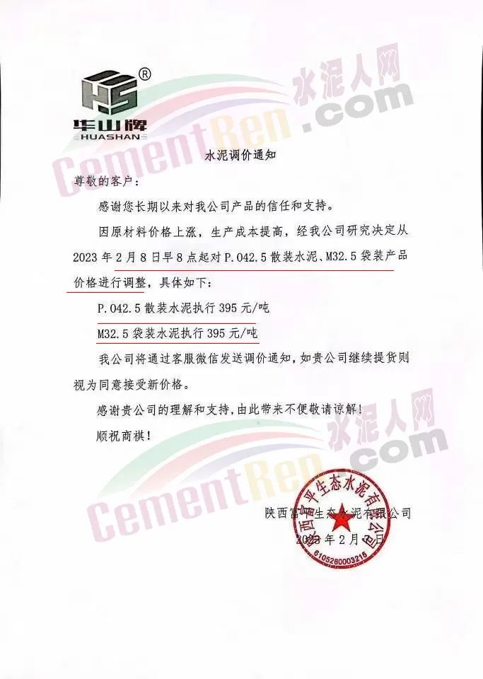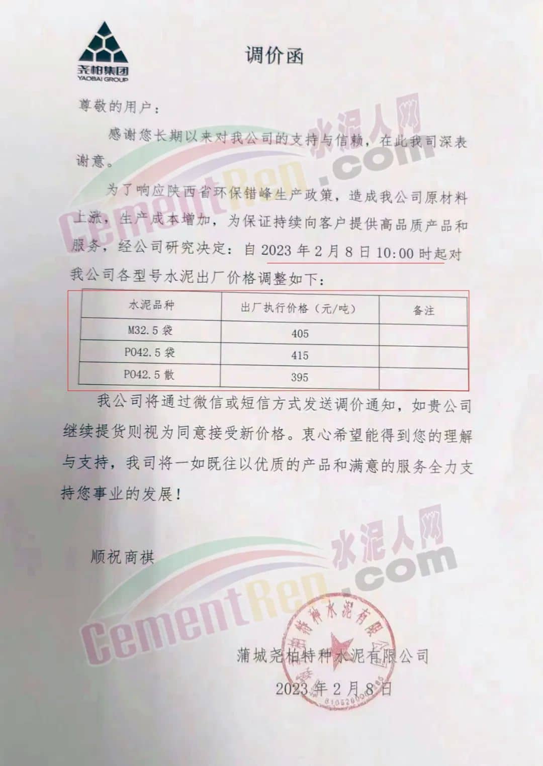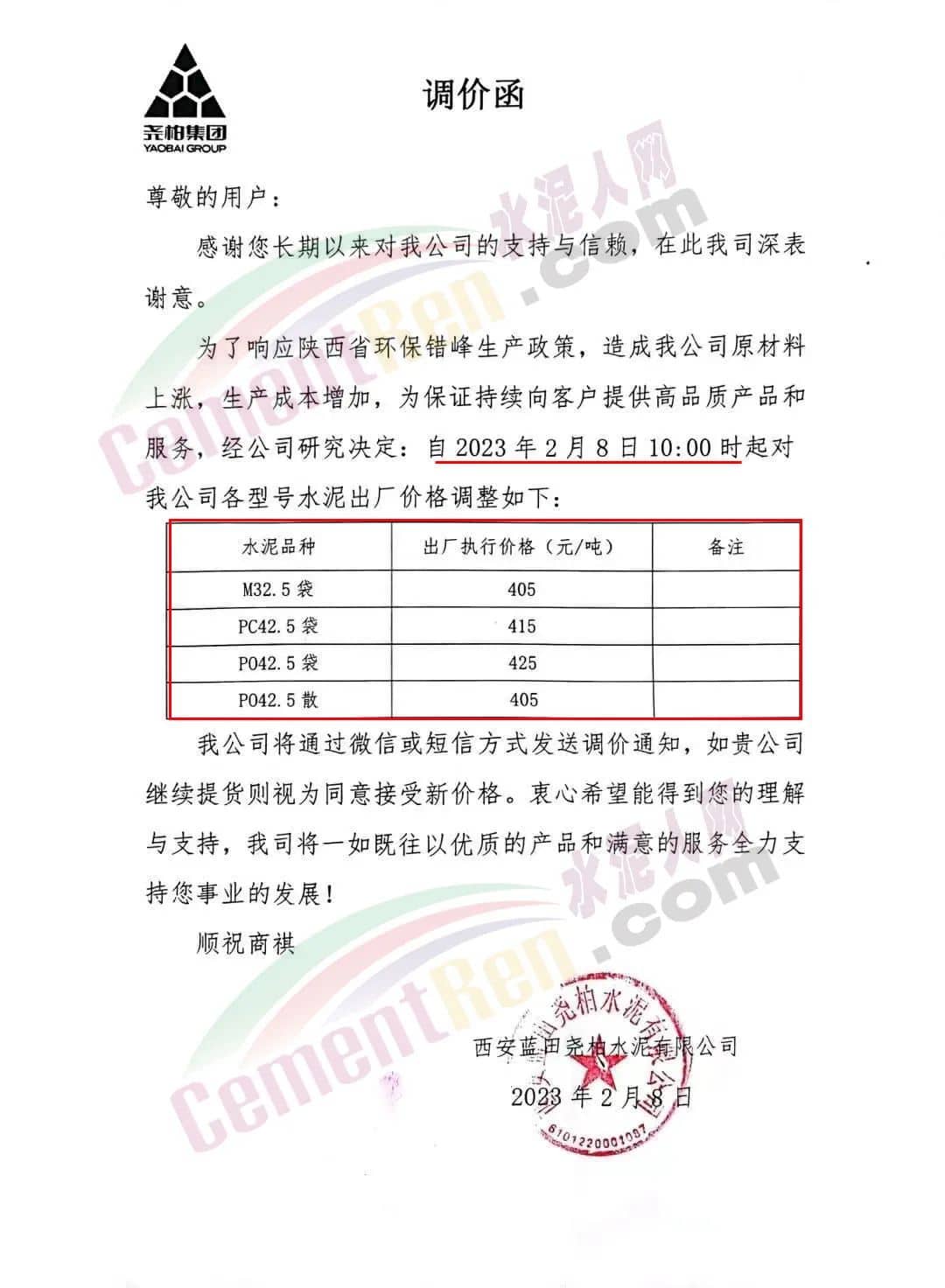 企業(yè)調價通知中提到,為響應陜西省環(huán)保錯峰生產(chǎn)政策,造成公司原材料上漲,生產(chǎn)成本增加,為保證持續(xù)向客戶提供高品質產(chǎn)品和服務經(jīng)公司研究決定自2月8日10時起對公司各型號水泥出廠價格進行調整。調價后,如客戶繼續(xù)提貨則視為同意價格。