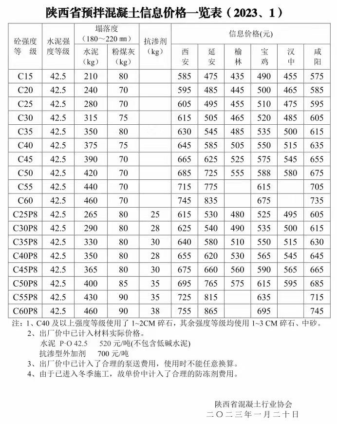 從陜西省混凝土行業(yè)協(xié)會近期發(fā)布的2023年1月預拌混凝土信息價格一覽表中可見,西安、延安、榆林、寶雞 、漢中、咸陽5個地區(qū)C30混凝土報價與2022年12月份持平。預拌混凝土材料實際價格中P.O42.5按520元/噸計算。上述主要品牌企業(yè)P.O42.5散裝水泥出廠價格上調后仍不足400元/噸,與信息價備注中的520元/噸仍相差125元/噸。