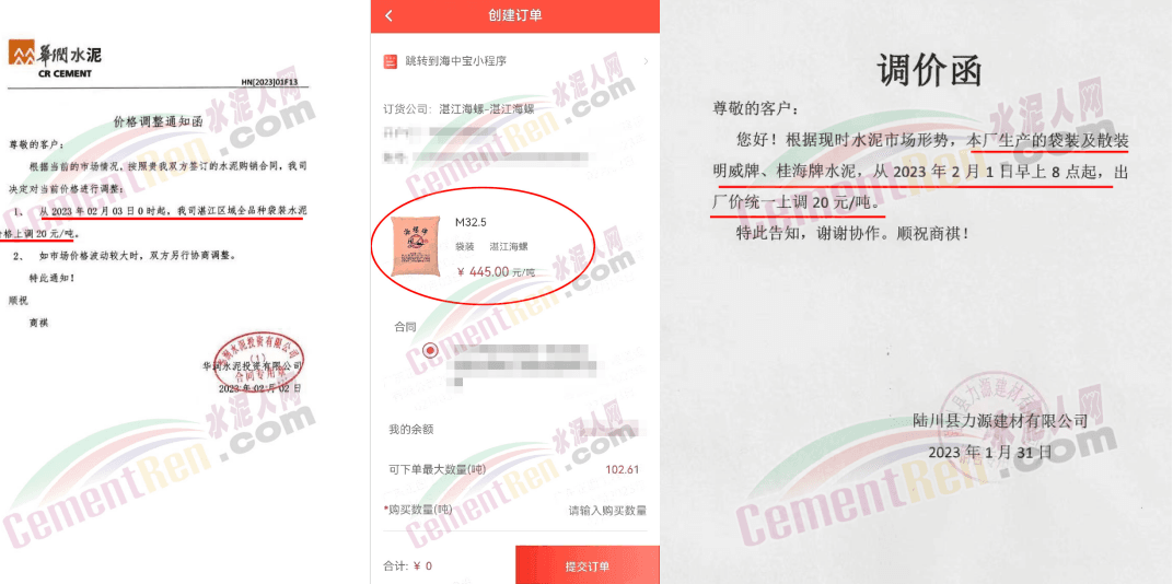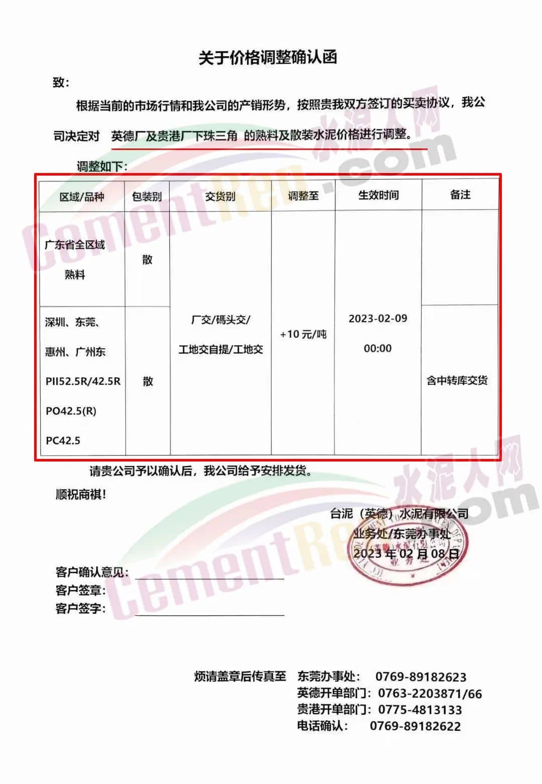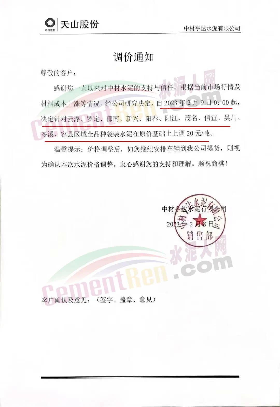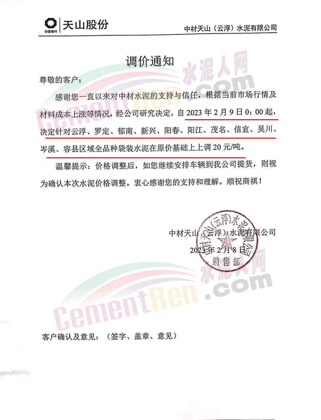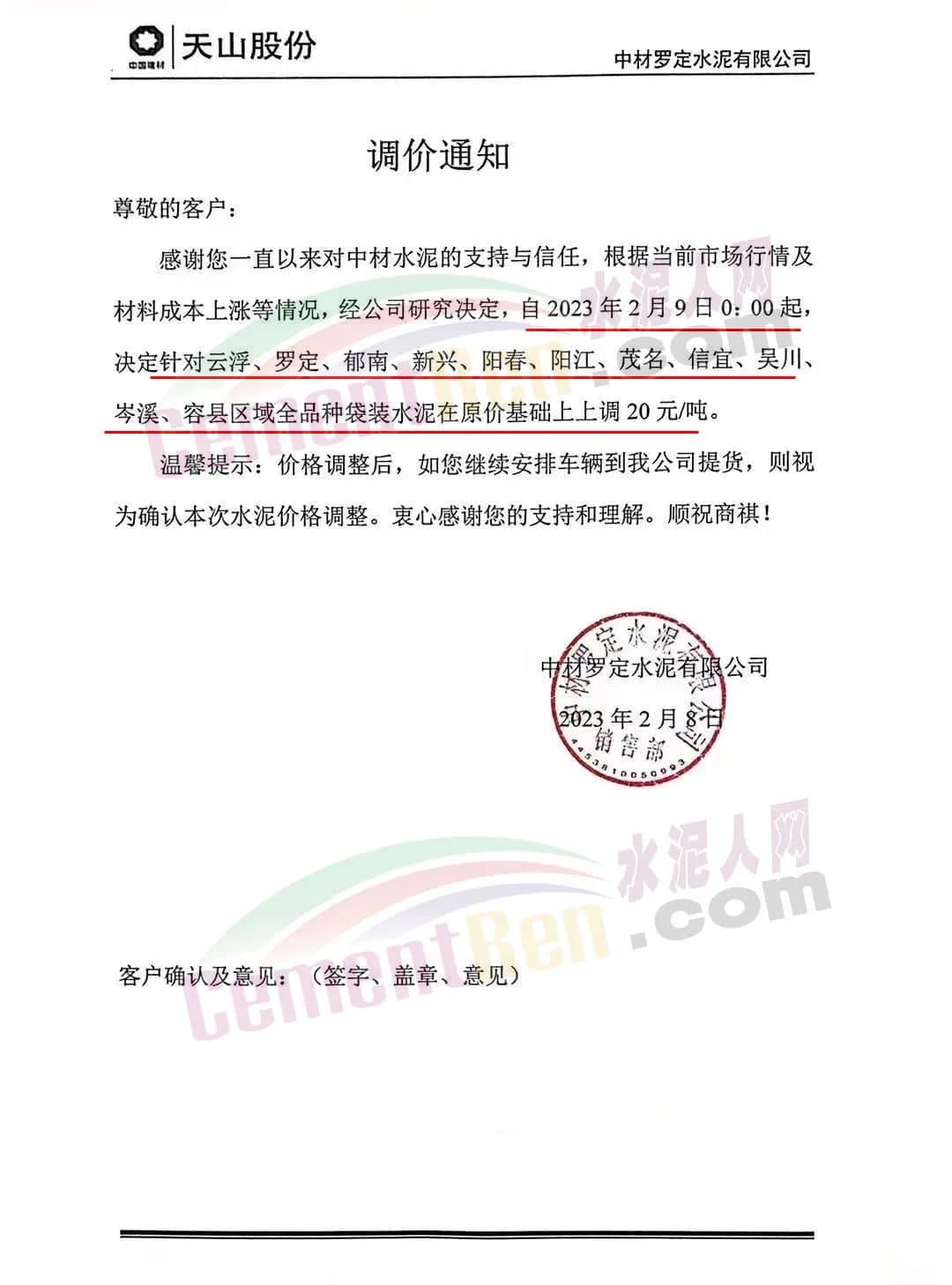 中材天山(云浮)水泥有限公司、中材亨達水泥有限公司、中材羅定水泥有限公司調價通知稱,根據(jù)當前市場行情及材料成本上漲等情況,經(jīng)公司研究決定,自2023年2月9日0時起決定針對云浮、羅定、郁南、新興、陽春、陽江、茂名、信宜、吳川、岑溪、容縣區(qū)域全品種袋裝水泥在原價基礎上上調20元/噸。