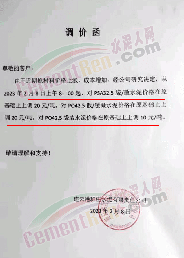 連云港班莊水泥有限責任公司通知稱,由于近期原材料價格上漲,成本增加。經(jīng)公司研究決定,從2023年2月8日上午8:00起,對PSA325袋/散水泥價格在原基礎上上調20元/噸,對PO42.5散/緩凝水泥價格在原基礎上上調20元/噸,對PO42.5袋裝水泥價格在原基礎上上調10元/噸。