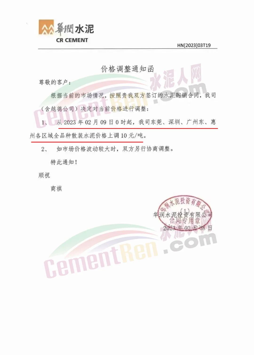 華潤水泥通知稱,根據(jù)當前的市場情況,從2月9日0時起,公司東莞、深圳、廣州東、惠州各區(qū)域全品種散裝水泥價格上調10元/噸。