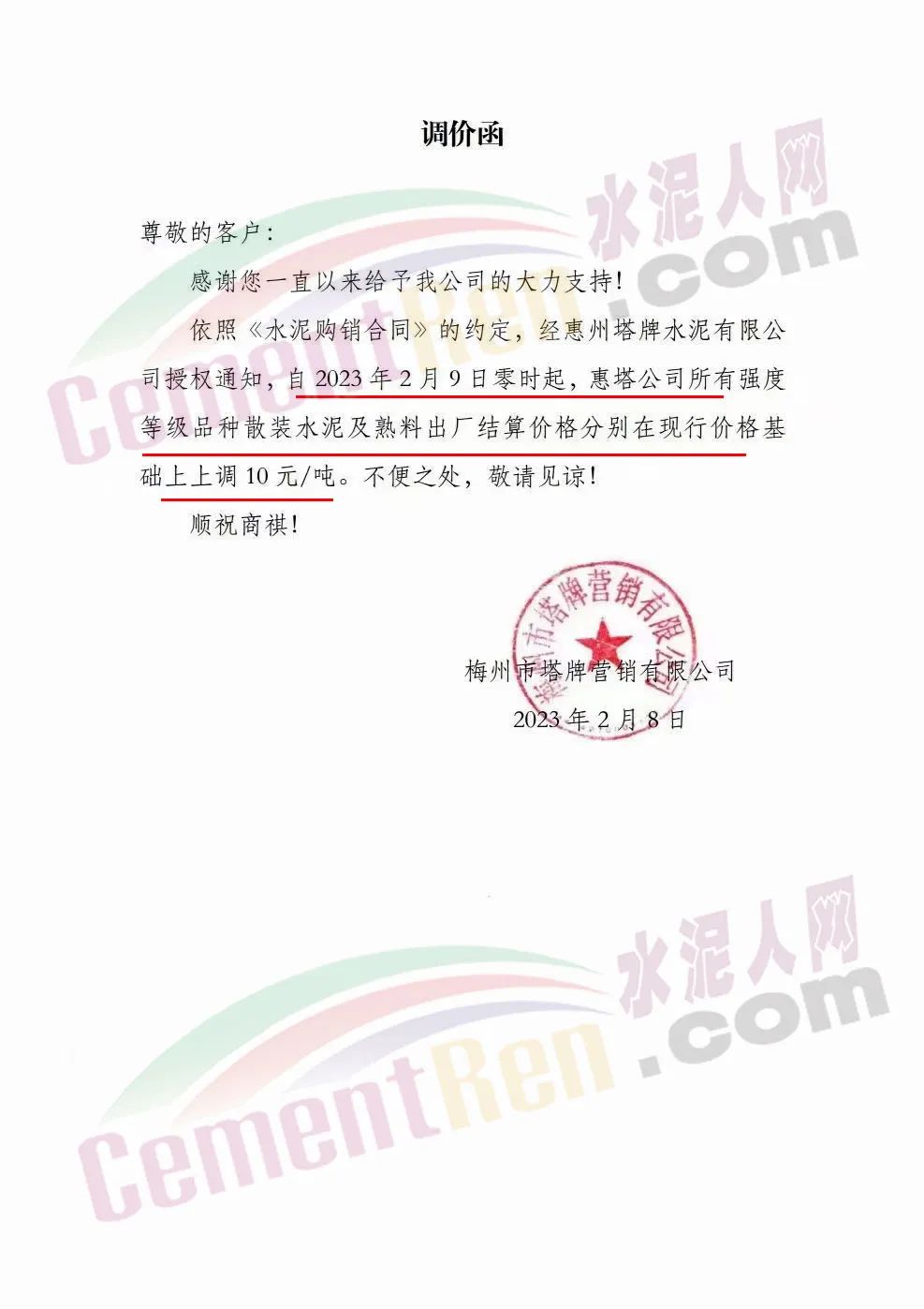 梅州塔牌營銷有限公司通知,自2月9日零時起,惠塔公司所有強度等級品種散裝水泥及熟料出廠結算價格上調10元/噸。