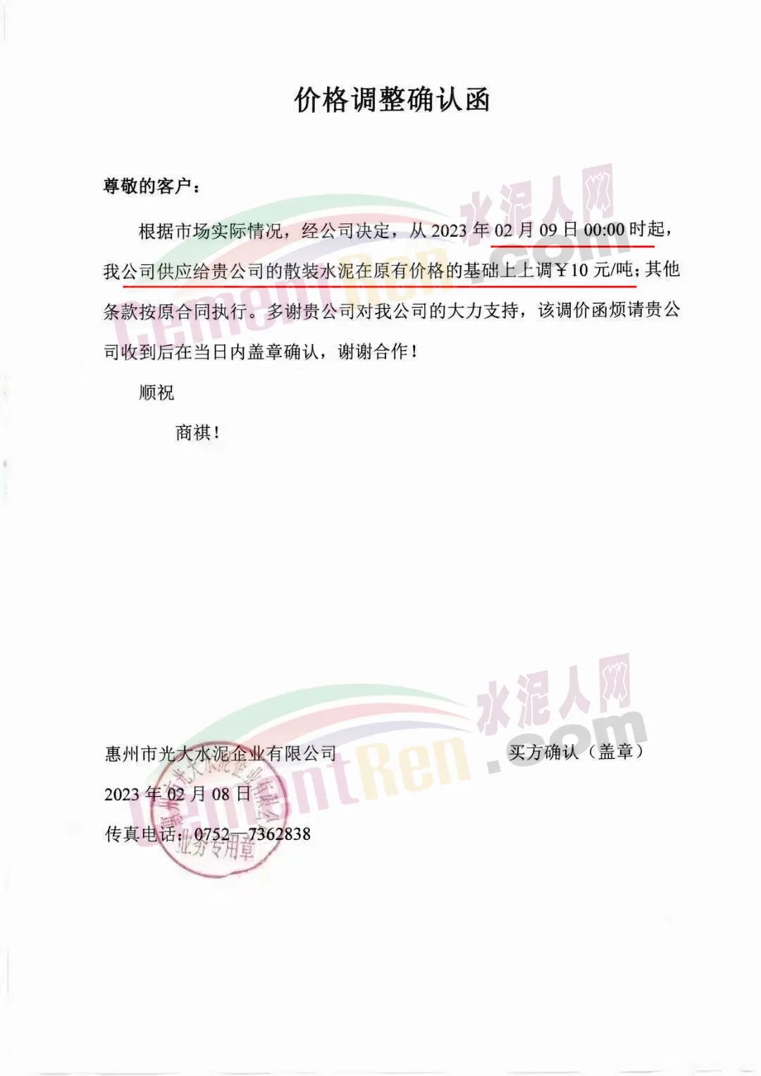 惠州光大水泥企業(yè)有限公司通知稱,根據(jù)市場實際情況,公司決定從2月9日0時起,散裝水泥在原有價格的基礎上上調10元/噸。