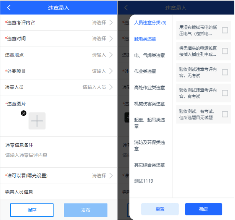 平臺(tái)中內(nèi)置了違章考評(píng)標(biāo)準(zhǔn)庫(kù),水泥企業(yè)單位管理員在作業(yè)現(xiàn)場(chǎng)可通過(guò)安培空間APP進(jìn)行拍照記錄人員違章行為后,選擇違章考評(píng)標(biāo)準(zhǔn)快速規(guī)范地錄入違章。系統(tǒng)將根據(jù)違章考評(píng)內(nèi)容,自動(dòng)扣減人員違章記分,并自動(dòng)下發(fā)反違章培訓(xùn)學(xué)習(xí)任務(wù)。