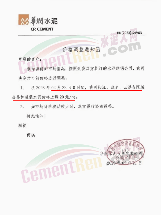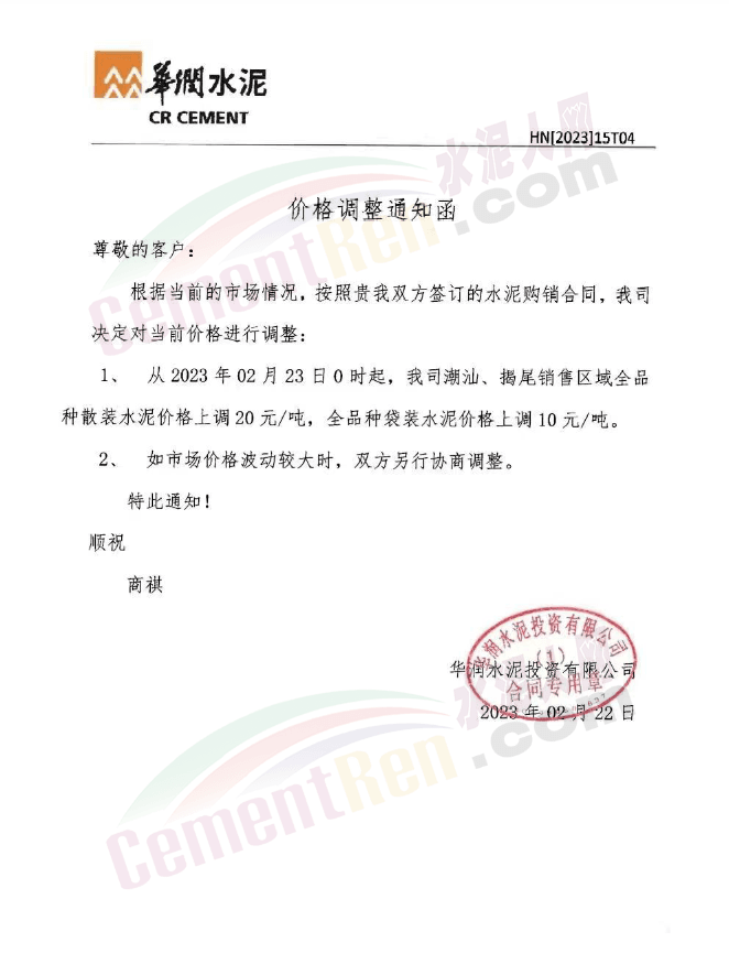 廣東區(qū)域華潤水泥投資有限公司從2023年2月23日0時起對發(fā)往以下的區(qū)域的水泥價格進(jìn)行調(diào)整。