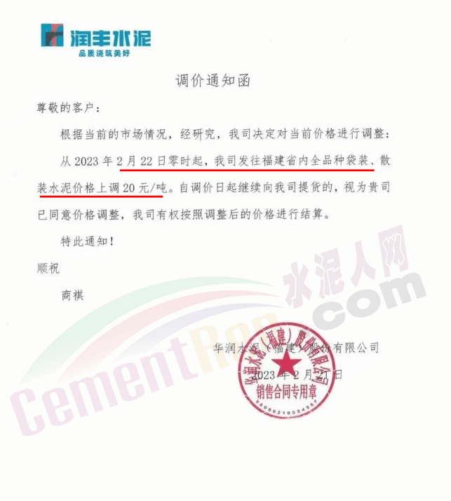 華潤水泥(福建)股份有限公司通知,2月22日零時起,公司發(fā)往福建省內(nèi)全品種袋裝、散裝水泥價格上調(diào)20元/噸。