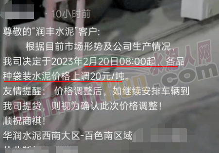 華潤水泥(平南)有限公司通知,定于2023年2月20日12:00時起發(fā)平南市場各品種袋裝水泥價格上調(diào)20元/噸。