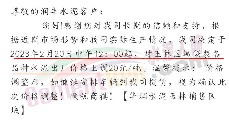 華潤水泥玉林銷售區(qū)通知,2月20日中午12時起,對玉林區(qū)域袋裝各品種水泥價格出廠價上調(diào)20元/噸。