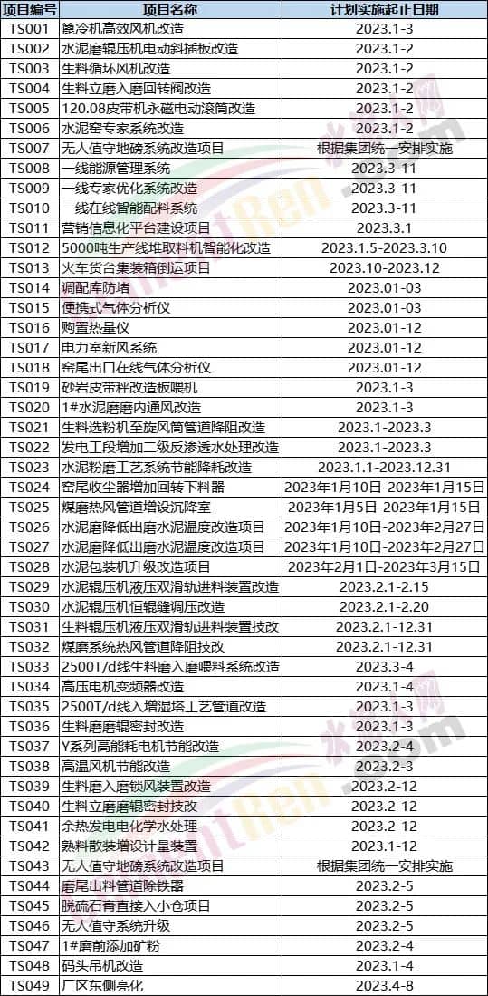 改善提升類項目包括,篦冷機高效風機改造、生料循環(huán)風機改造、生料立磨入磨回轉(zhuǎn)閥改造、皮帶機永磁電動滾筒改造、水泥窯專家系統(tǒng)改造、無人值守地磅系統(tǒng)改造項目、水泥粉磨工藝系統(tǒng)節(jié)能降耗改造、窯尾收塵器增加回轉(zhuǎn)下料器、煤磨熱風管道增設沉降室、水泥磨降低出磨水泥溫度改造項目、水泥包裝機升級改造項目、高壓電機變頻器改造、生料磨磨輥密封改造、磨尾出料管道除鐵器、脫硫石膏直接入小倉項目、無人值守系統(tǒng)升級、磨前添加礦粉、碼頭吊機改造、廠區(qū)亮化工程等。
