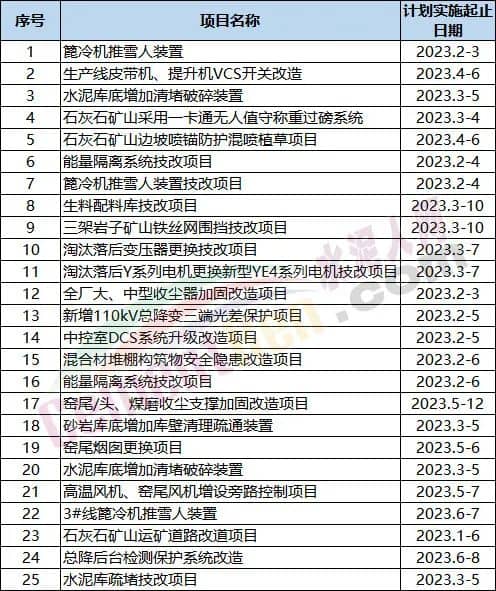 安全類項目涉及變頻器升級、皮帶廊加固、頭尾煤轉(zhuǎn)子秤控制系統(tǒng)、變頻器水冷系統(tǒng)、安全監(jiān)控網(wǎng)絡系統(tǒng)、高溫風機改造、火災檢測與自動報警裝置、窯尾收塵器技改、煤粉制備防爆系統(tǒng)、原煤輸送系統(tǒng)及煤粉制備系統(tǒng)防爆電機改造、篦冷機推雪人裝置、生產(chǎn)線皮帶機、提升機VCS開關(guān)改造、水泥庫底增加清堵破碎裝置、石灰石礦山采用一卡通無人值守稱重過磅系統(tǒng)、石灰石礦山邊坡噴錨防護混噴植草項目、能量隔離系統(tǒng)技改項目、生料配料庫技改項目、淘汰落后變壓器更換技改項目、全廠大、中型收塵器加固改造項目、中控室DCS系統(tǒng)升級改造項目改造項目、混合材堆棚構(gòu)筑物安全隱患改造項目、水泥庫底增加清堵破碎裝置、高溫風機、窯尾風機增設旁路控制項目、石灰石礦山運礦道路改道項目、總降后臺檢測保護系統(tǒng)改造、水泥庫疏堵技改項目以及礦山基建項目等。