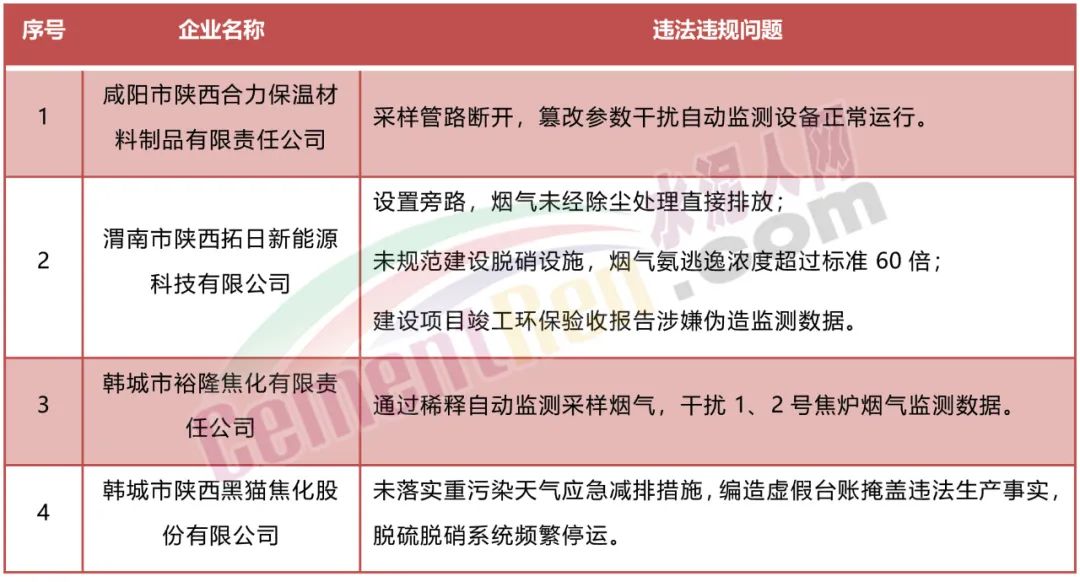 2月21日~22日,生態(tài)環(huán)境部副部長趙英民帶隊赴陜西省咸陽市、渭南市和韓城市等空氣質(zhì)量明顯反彈城市監(jiān)督幫扶,對涉氣重點企業(yè)開展“四不兩直”督導(dǎo)檢查發(fā)現(xiàn)4家企業(yè)問題突出: