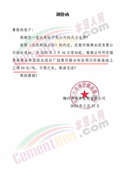 據(jù)水泥人網(wǎng)信息中心數(shù)據(jù),2月內(nèi)塔牌水泥已經(jīng)陸續(xù)發(fā)出近10份漲價(jià)函。