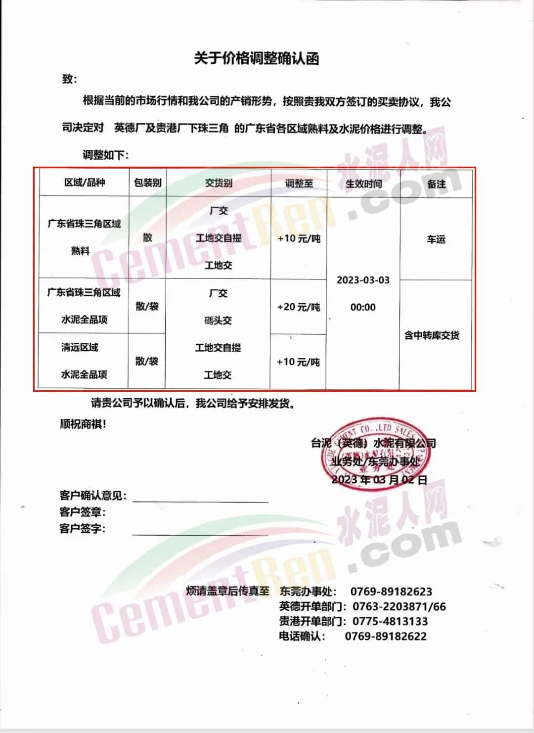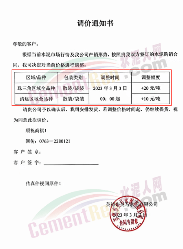 臺(tái)泥(英德)水泥有限公司通知,根據(jù)當(dāng)前的市場(chǎng)行情和公司產(chǎn)銷形勢(shì),決定自3月3日0時(shí)起對(duì)英德廠及貴港廠下珠三角的廣東省各區(qū)域熟料價(jià)格上調(diào)10元/噸,廣東省珠三角區(qū)域全品項(xiàng)水泥上調(diào)20元/噸,清遠(yuǎn)區(qū)域上調(diào)10元/噸。
