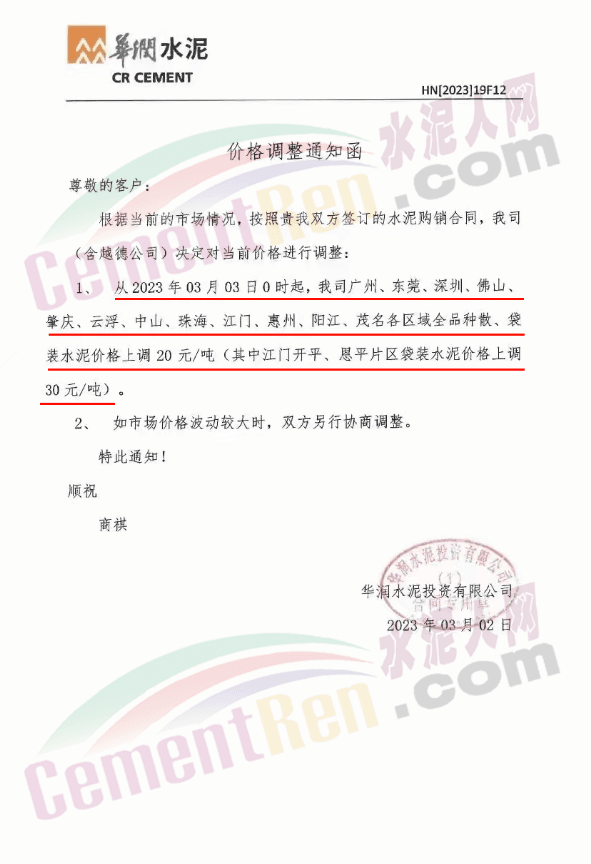 華潤(rùn)水泥通知,從3月3日0時(shí)起,公司廣州、東莞、深圳、佛山肇慶、云浮、中山、珠海、江門、惠州、陽(yáng)江、茂名各區(qū)域全品種散裝、袋裝水泥價(jià)格上調(diào)20元/噸,其中江門開平、恩平片區(qū)袋裝水泥價(jià)格上調(diào)30元/噸。