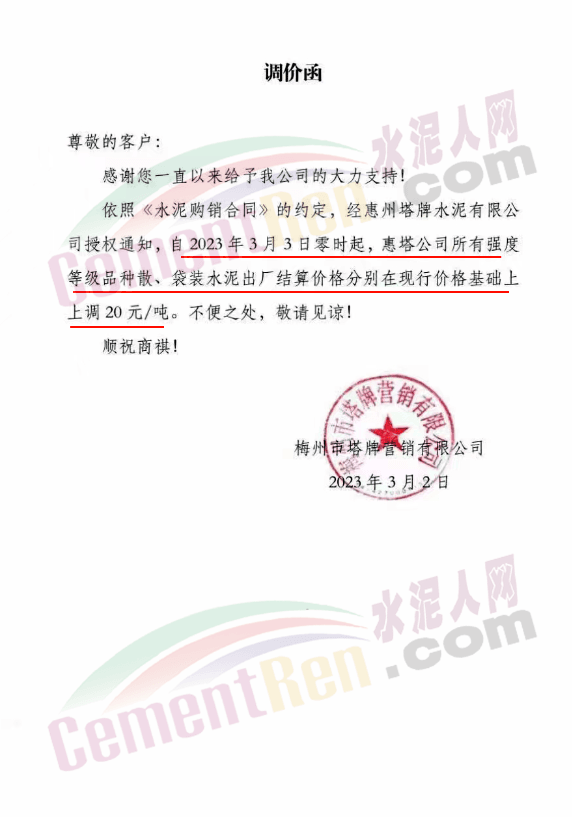 塔牌水泥通知,經(jīng)惠州塔牌水泥有限公司授權(quán)通知,自3月3日零時(shí)起,惠塔公司所有強(qiáng)度等級(jí)品種散、袋裝水泥出廠結(jié)算價(jià)格分別在現(xiàn)行價(jià)格基礎(chǔ)上上調(diào)20元/噸。