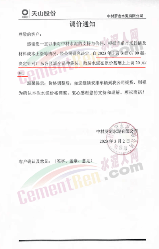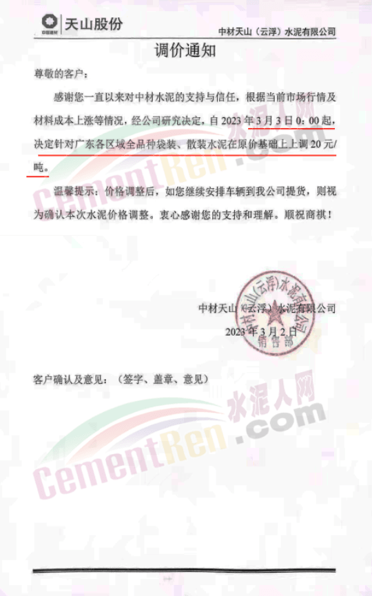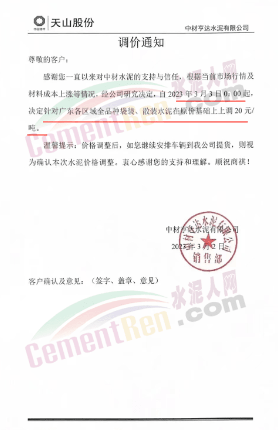 天山股份中材亨達(dá)水泥有限公司通知,根據(jù)當(dāng)前市場(chǎng)行情及材料成本上漲等情況,經(jīng)公司研究決定,自3月3日0時(shí)起決定針對(duì)廣東各區(qū)域全品種袋裝、散裝水泥在原價(jià)基礎(chǔ)上上調(diào)20元/噸。