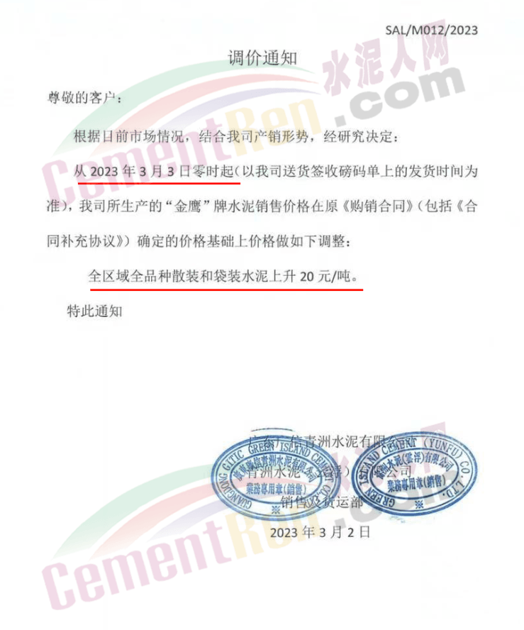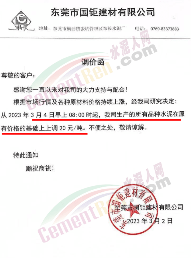 東莞市國(guó)鉅建材有限公司通知,根據(jù)市場(chǎng)行情及各種原材料價(jià)格持續(xù)上漲,經(jīng)公司研究決定從2023年3月4日早上8時(shí)起,公司生產(chǎn)的所有品種水泥在原有價(jià)格的基礎(chǔ)上上調(diào)20元/噸。