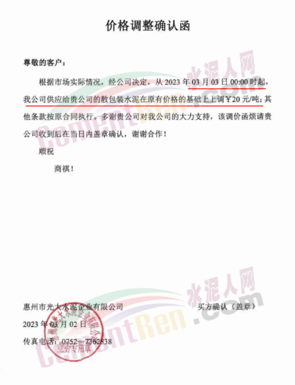 光大水泥通知,3月3日0時(shí)起,散包裝水泥價(jià)格上調(diào)20元/噸。
