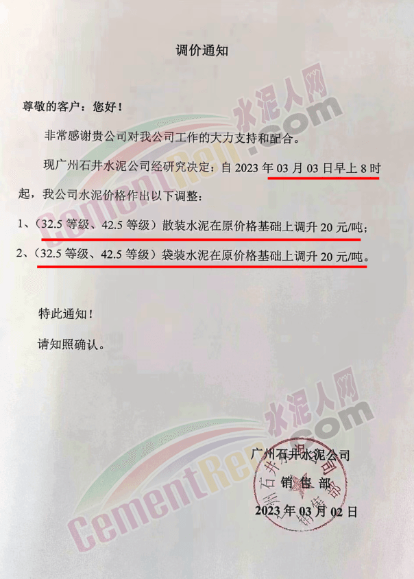 廣州石井水泥、石井德慶水泥通知,自3月3日早上8時(shí)起,公司各標(biāo)號(hào)水泥上調(diào)20元/噸。