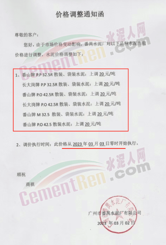 廣州市番禺水泥廠有限公司通知,從3月3日0時(shí)起各品種水泥上調(diào)20元/噸。