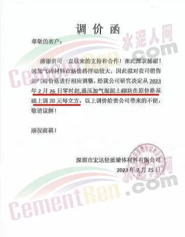 深圳市宏達(dá)輕質(zhì)墻體材料有限公司通知,因加氣磚材料市場(chǎng)價(jià)格浮動(dòng)較大,經(jīng)公司研究決定從2023年2月26日零時(shí)起,蒸壓加氣混凝土砌塊在原價(jià)格基礎(chǔ)上調(diào)20元每立方。