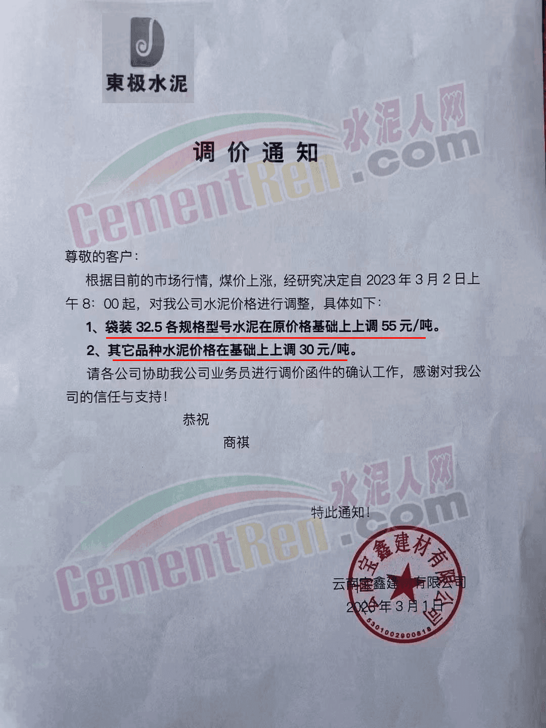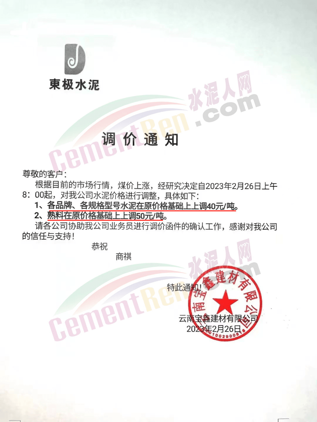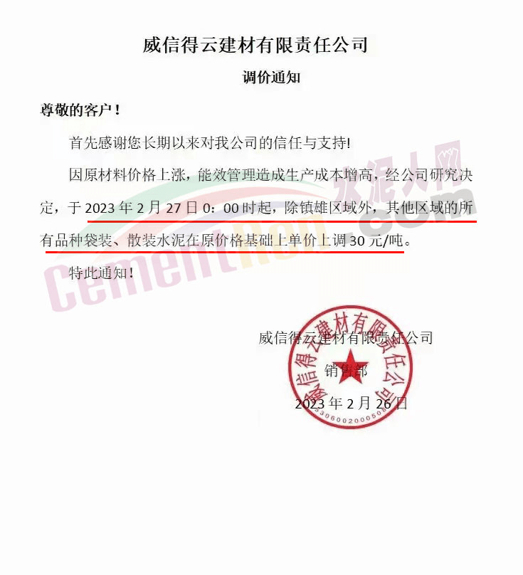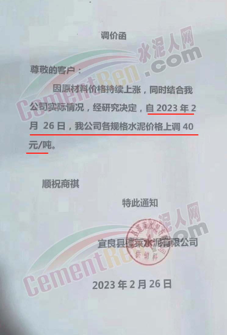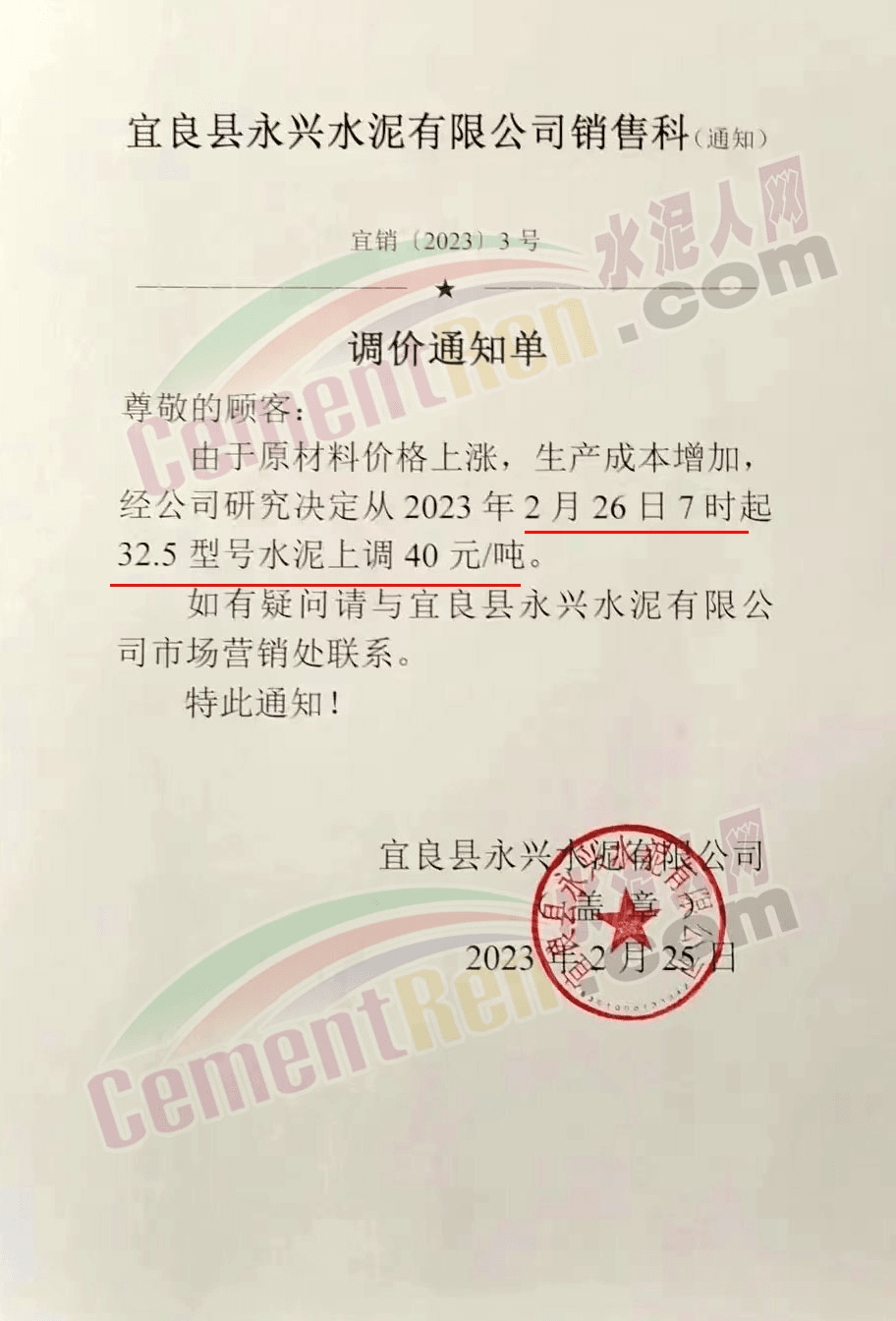 宜良縣永興水泥有限公司銷售科通知,由于原材料價(jià)格上漲,生產(chǎn)成本增加,經(jīng)公司研究決定從2023年2月26日7時(shí)起32.5型號(hào)水泥上調(diào)40元/噸。