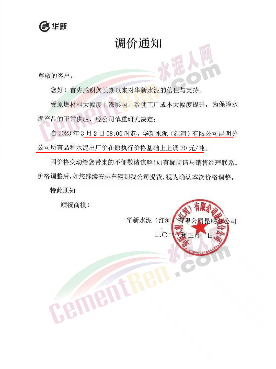 華新水泥紅河公司昆明分公司通知,受原燃材料大幅度上漲影響,致使工廠成本大幅度提升,為保障水泥產(chǎn)品的正常供應(yīng),經(jīng)公司慎重研究決定,2023年3月2日8時(shí)起,華新水泥(紅河)有限公司昆明分公司所有品種水泥出廠價(jià)在原執(zhí)行價(jià)格基礎(chǔ)上上調(diào)30元/噸。