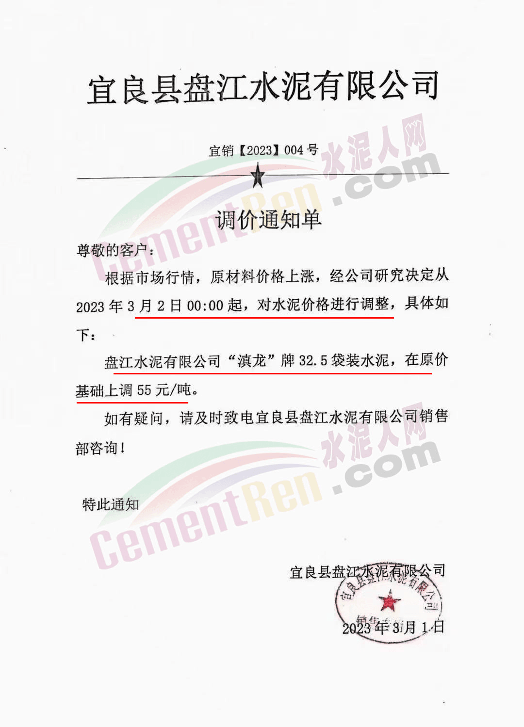 宜良縣盤江水泥有限公司通知根據(jù)市場(chǎng)行情,原材料價(jià)格上漲,經(jīng)公司研究決定從2023年3月2日0時(shí)起,對(duì)“滇龍”牌32.5袋裝水泥,在原價(jià)基礎(chǔ)上調(diào)55元/噸。