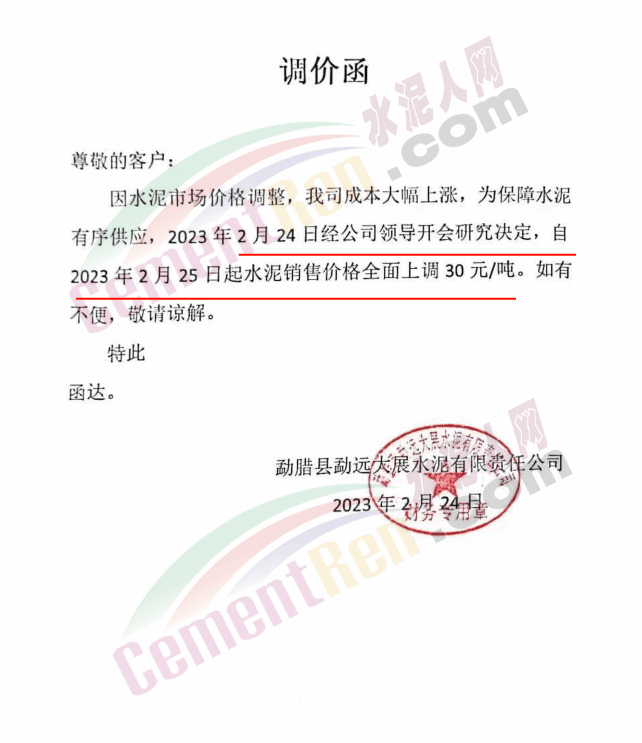 勐臘縣勐遠(yuǎn)大展水泥有限責(zé)任公司通知,水泥市場(chǎng)價(jià)格調(diào)整,公司成本大幅上漲,為保障水泥有序供應(yīng),經(jīng)公司領(lǐng)導(dǎo)開會(huì)研究決定,自2023年2月25日起水泥銷售價(jià)格全面上調(diào)30元/噸。