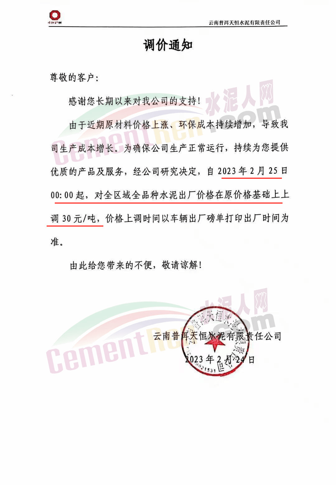云南普洱天恒水泥有限責(zé)任公司通知,由于近期原材料價(jià)格上漲、環(huán)保成本持續(xù)增加,導(dǎo)致公司生產(chǎn)成本增長(zhǎng)。為確保公司生產(chǎn)正常運(yùn)行,經(jīng)公司研究決定,自2023年2月25日0時(shí)起,對(duì)全區(qū)域全品種水泥出廠價(jià)格上調(diào)30元/噸。