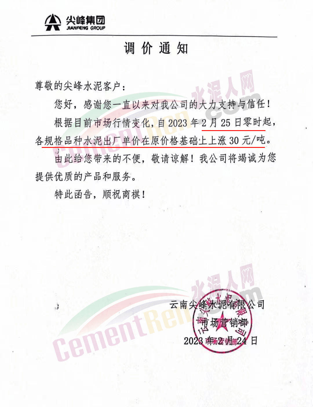 云南尖峰水泥通知自2023年2月25日零時(shí)起各規(guī)格品種水泥出廠價(jià)在原價(jià)格基礎(chǔ)上上漲30元/噸。