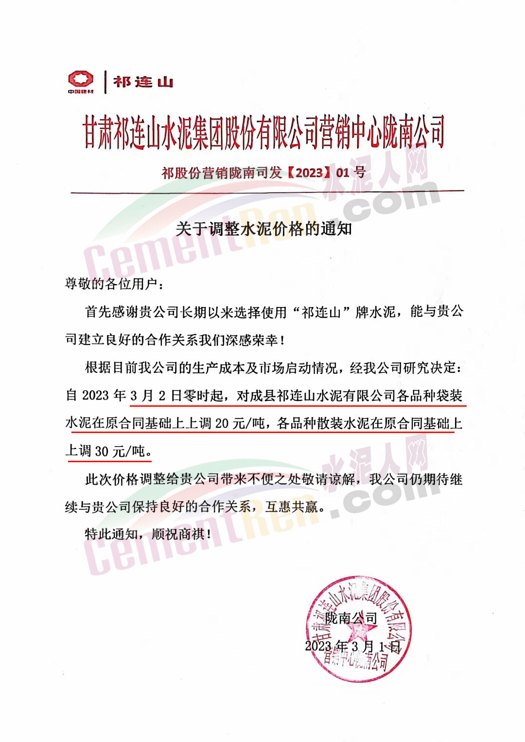 同期,甘肅區(qū)域龍頭企業(yè)祁連山水泥隴南公司通知,根據(jù)目前公司的生產(chǎn)成本及市場(chǎng)啟動(dòng)情況,經(jīng)公司研究決定自2023年3月零時(shí)起,對(duì)成縣祁連山水泥有限公司各品種袋裝水泥在原合同基礎(chǔ)上上調(diào)20元/噸,各品種散裝水泥在原合同基礎(chǔ)上上調(diào)30元/噸。