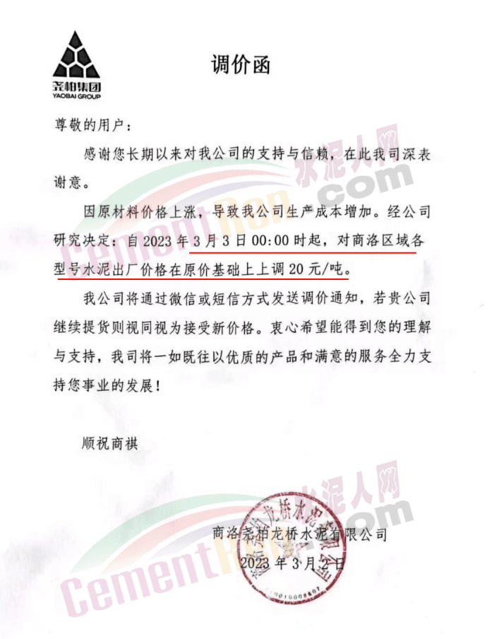 陜西主要品牌商洛堯柏龍橋水泥通知,因原材料價(jià)格上漲,導(dǎo)致公司生產(chǎn)成本增加,經(jīng)公司研究決定自3月3日0時(shí)起,對(duì)商洛區(qū)域各型號(hào)水泥出廠價(jià)格上調(diào)20元/噸。