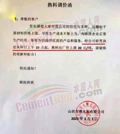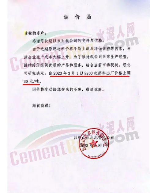 呂梁山水水泥通知,由于近期原燃材料價(jià)格不斷上漲及環(huán)保管控等因素,導(dǎo)致企業(yè)生產(chǎn)成本大幅上升,為了維持公司正常生產(chǎn)經(jīng)營(yíng),結(jié)合當(dāng)前市場(chǎng)現(xiàn)狀,經(jīng)公司研究決定,自2023年3月1日8時(shí)起熟料出廠價(jià)格上調(diào)30元/噸。