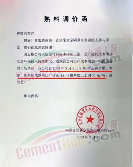 太原金隅冀東水泥通知因近期公司采購(gòu)原材料成本持續(xù)上漲,生產(chǎn)能耗成本增加以及環(huán)保投入持續(xù)加大,造成公司生產(chǎn)成本增加。根據(jù)當(dāng)前的市場(chǎng)情況,公司自2023年3月1日8時(shí)起將呂梁、太原、陽(yáng)泉區(qū)域熟料出廠價(jià)在現(xiàn)行價(jià)格基礎(chǔ)上上調(diào)30元/噸。