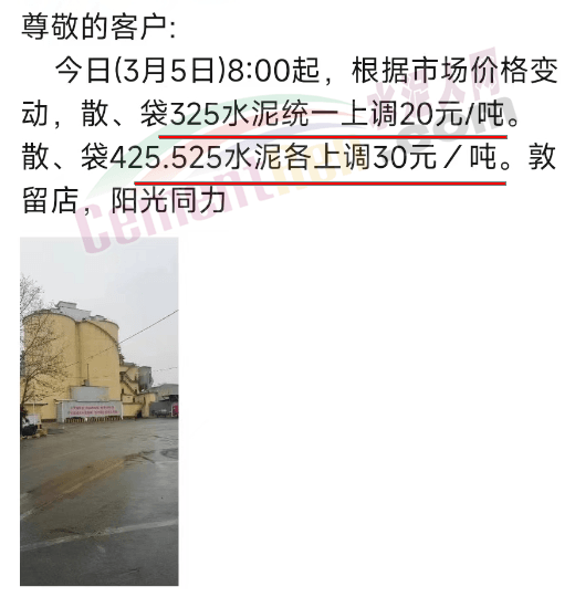 日前,河南區(qū)域陽光同力通知3月5日8時(shí)起,根據(jù)市場價(jià)格變動(dòng),散、袋32.5水泥統(tǒng)一上調(diào)20元/噸。散、袋42.5、52.5水泥各上調(diào)30元/噸。