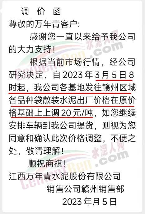江西萬年青水泥贛州銷售部通知,根據(jù)當(dāng)前市場行情,經(jīng)公司研究決定,自2023年3月5日8時(shí)起,各基地發(fā)往贛州區(qū)域各品種袋散裝水泥出廠價(jià)格在原價(jià)格基礎(chǔ)上上調(diào)20元/噸。